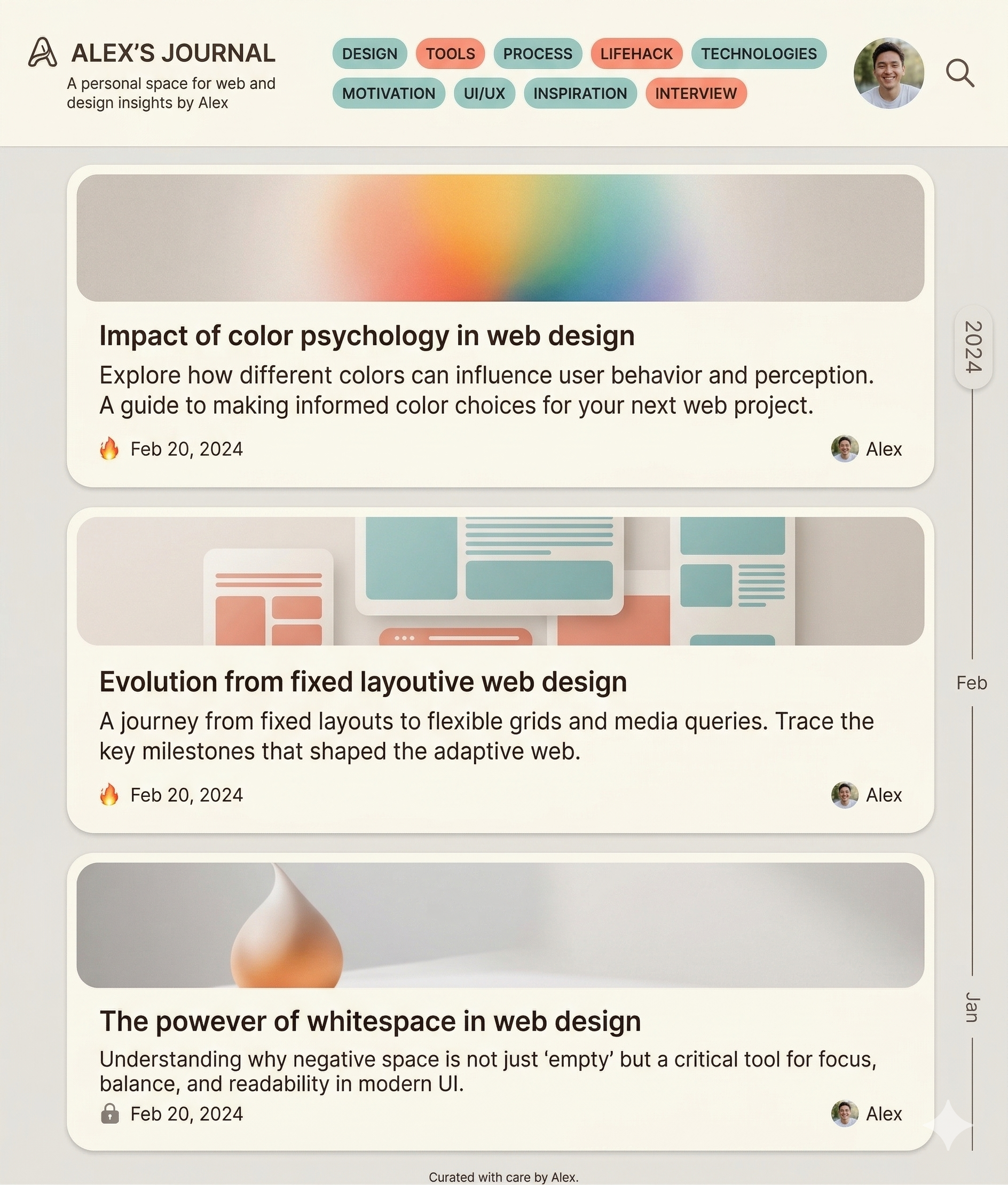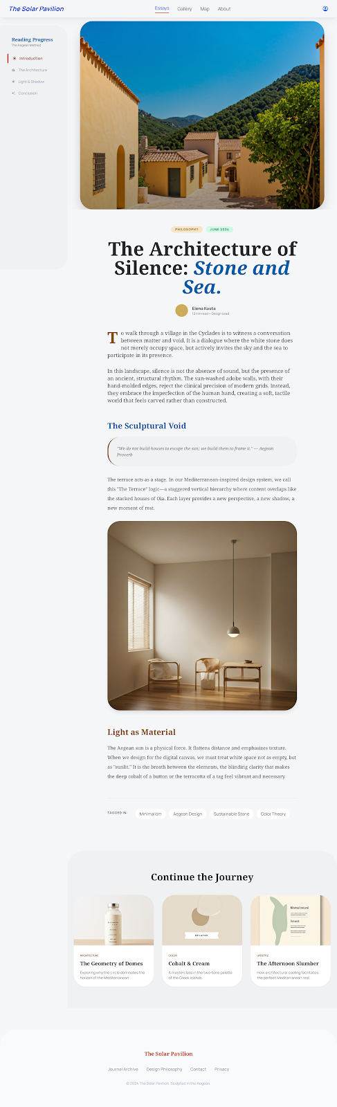 I asked Stitch to make a template with straightforward single posts with images in the posts. This was all for the home page, using that image as color reference inspiration.