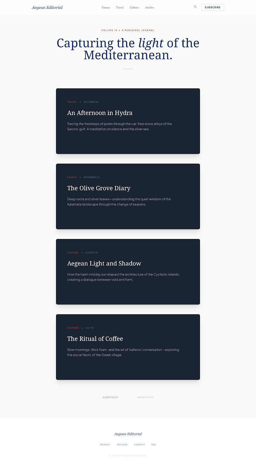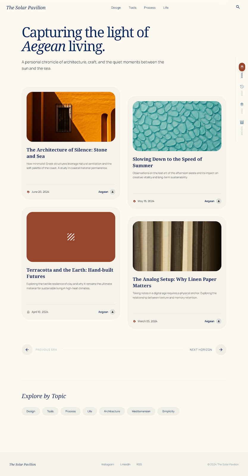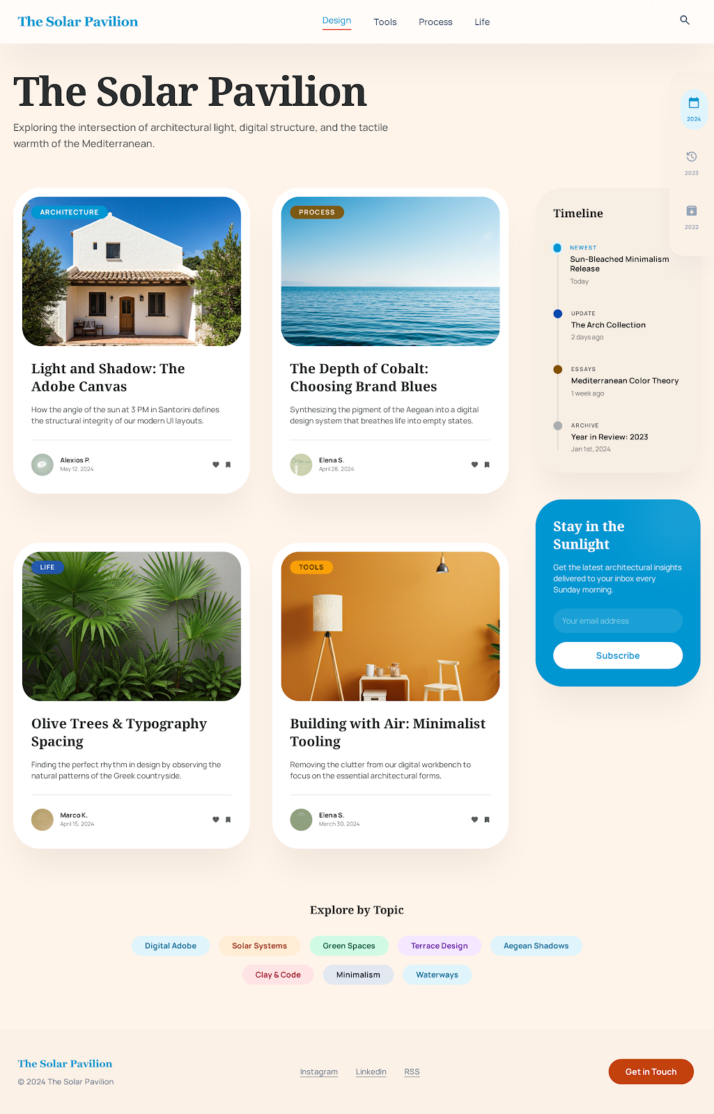 Greece is one of my favorite places on earth, so I decided on a color scheme inspired by Santorini. I'd seen a really cute illustration from Guillaume Kurkdjian, and used that as color inspiration. Also found a Ghost template that was straightforward and simple, so I used that as my starting point for a layout. Here's the color scheme that Stitch created.
